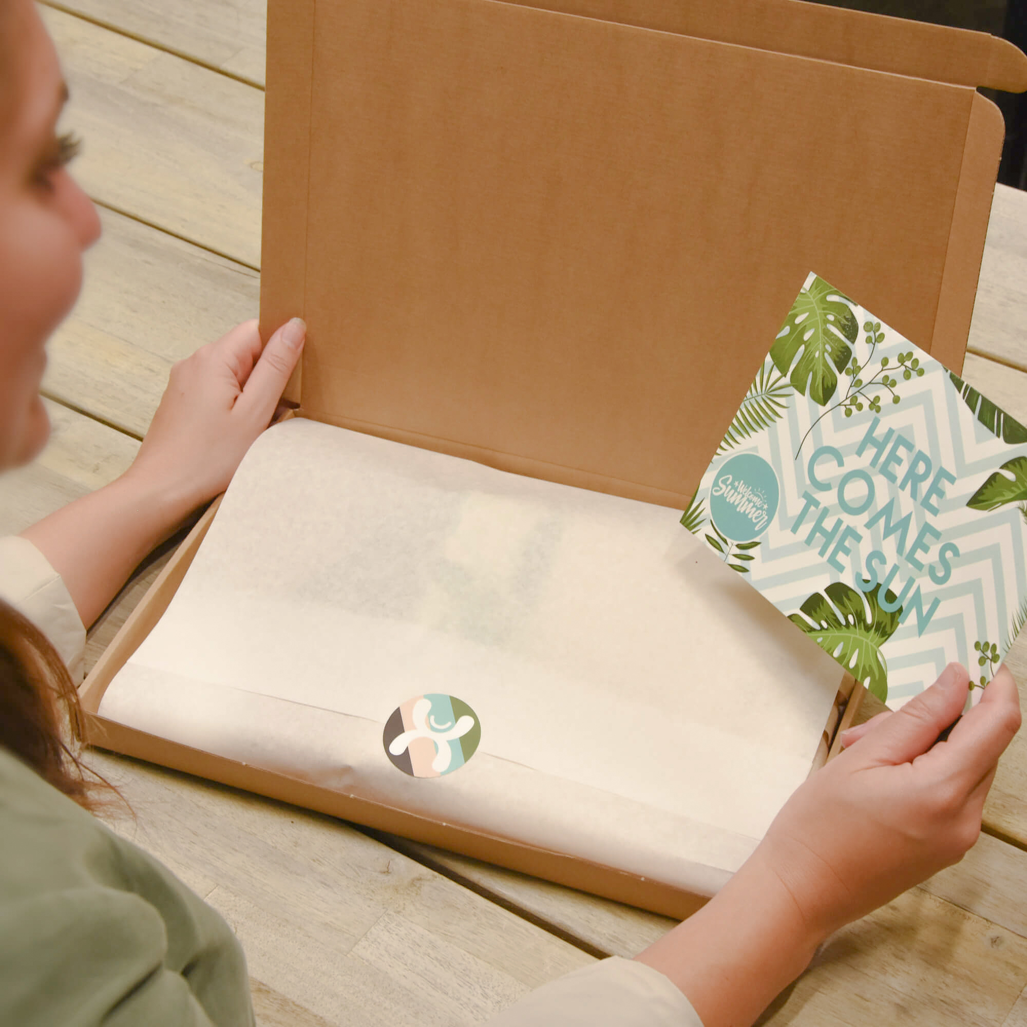 Μια γυναίκα ανοίγει ένα χάρτινο κουτί με ένα καλοκαιρινό κιτ βασικών προϊόντων μέσα, επιδεικνύοντας διαφημιστικά και εταιρικά δώρα.