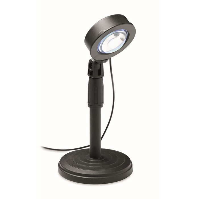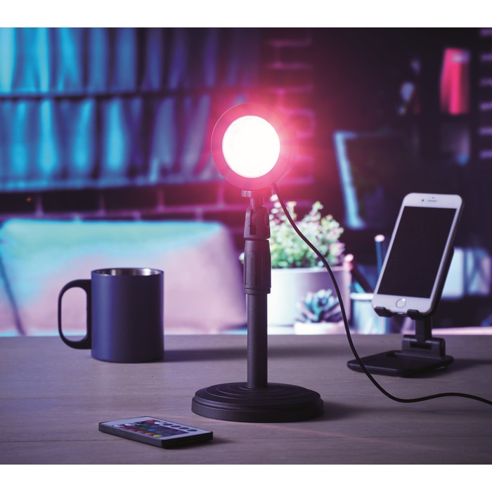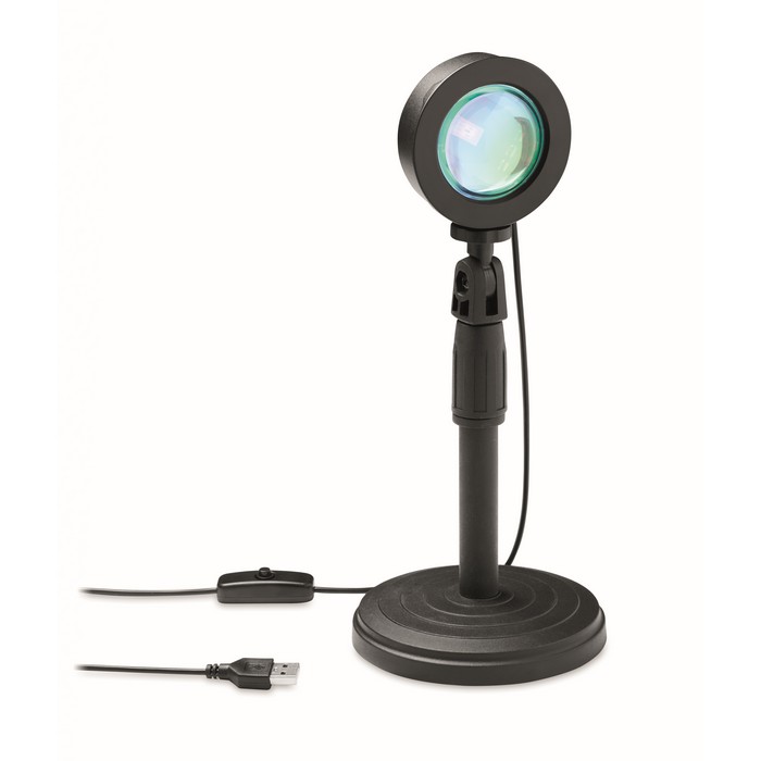 360 Degree rotation multi colour sunset projection lamp in ABS. 16 colours, flash, strobe and smooth mode. Including USB charging cable, stand and remote control.
