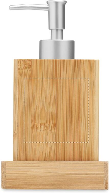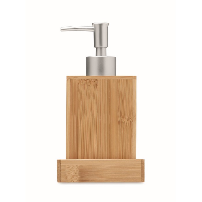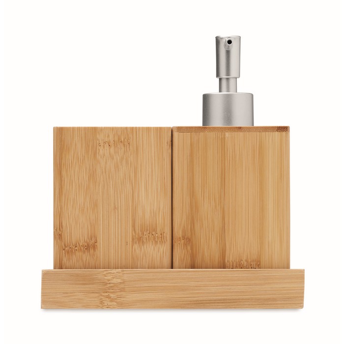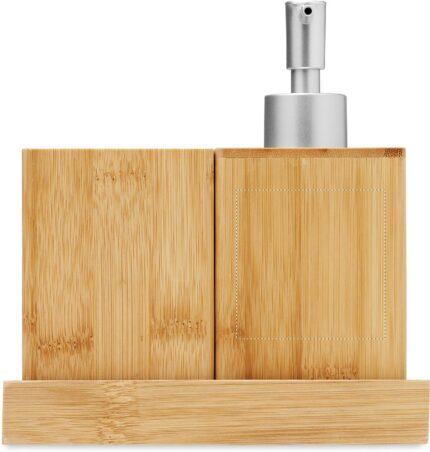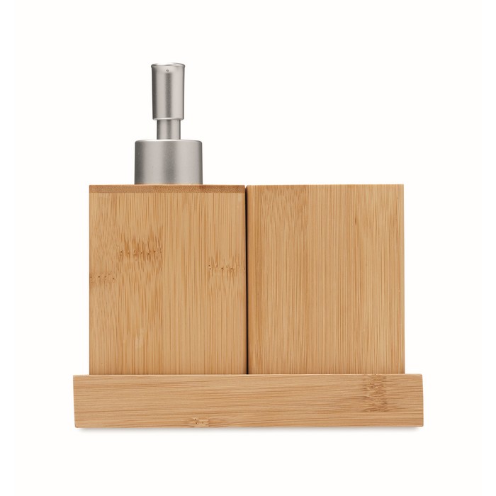 3-piece bamboo bathroom accessories set. Including soap pump, tumbler and tray.
