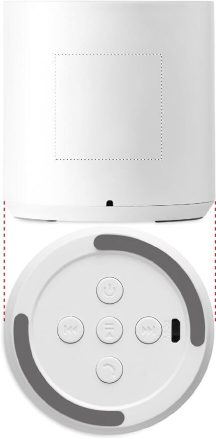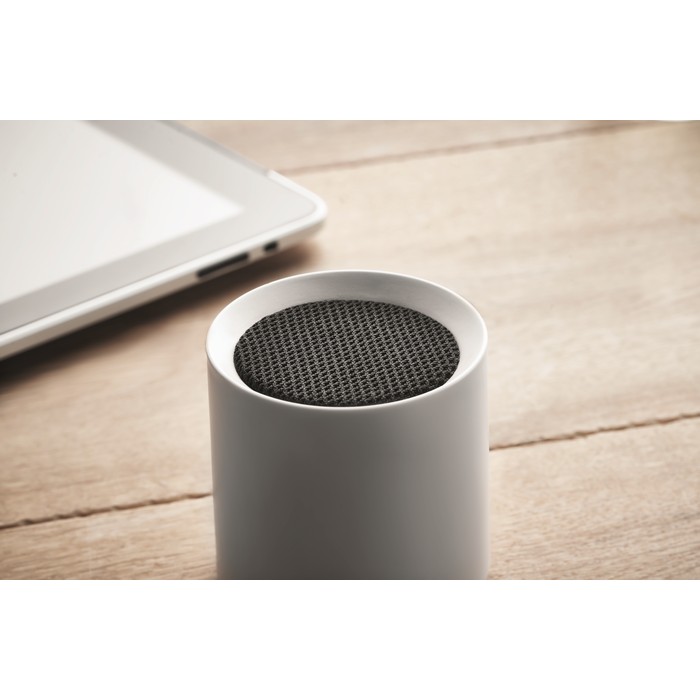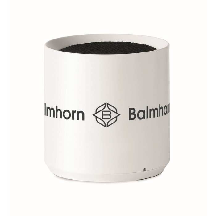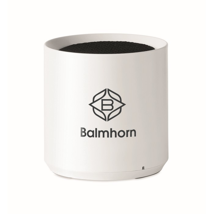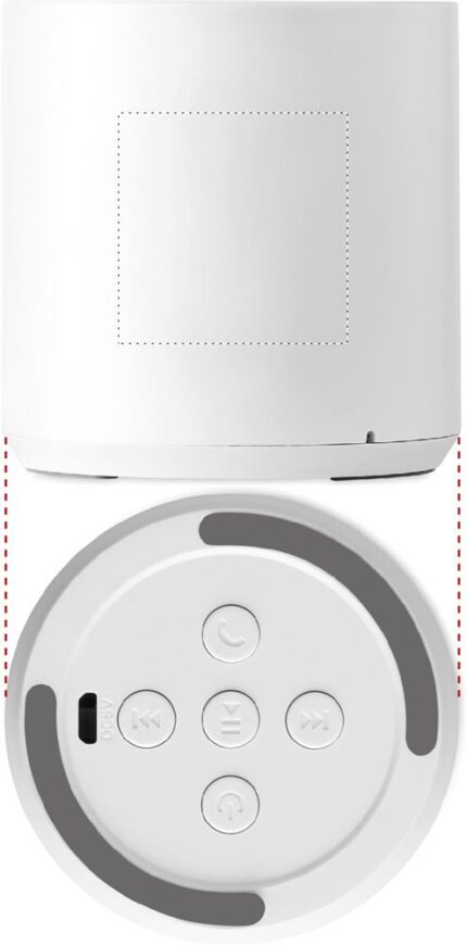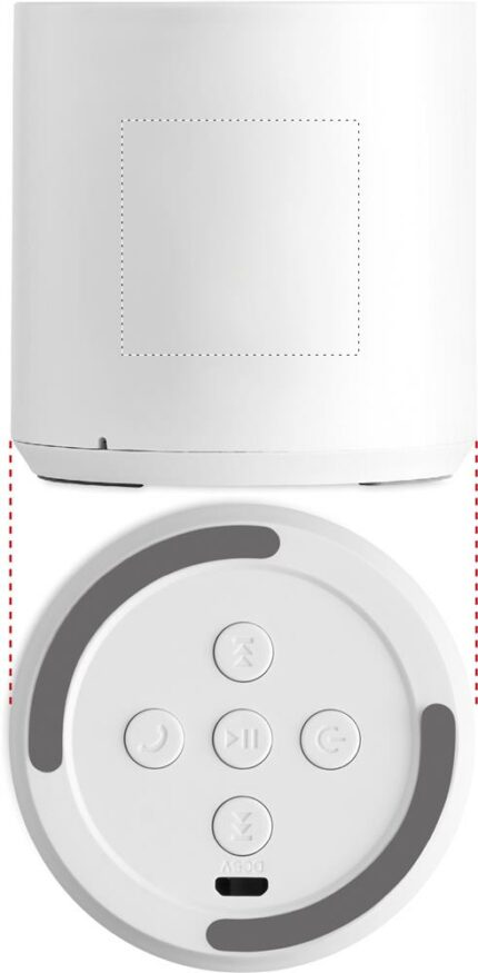 Recycled ABS 5.0 wireless speaker with LED light indication. 1 Rechargeable Li-ion 300 mAh battery included. Output data: 3W, 3 Ohm and 5V. Playing time approx. 2h.