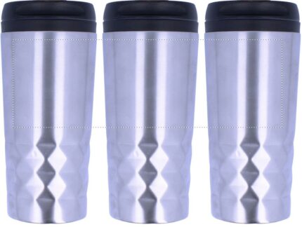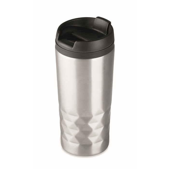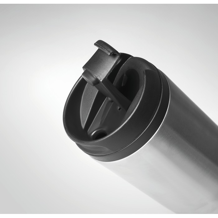 Double wall stainless steel travel cup with inner PP and lid. Capacity: 280 ml.