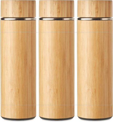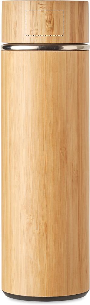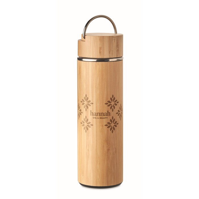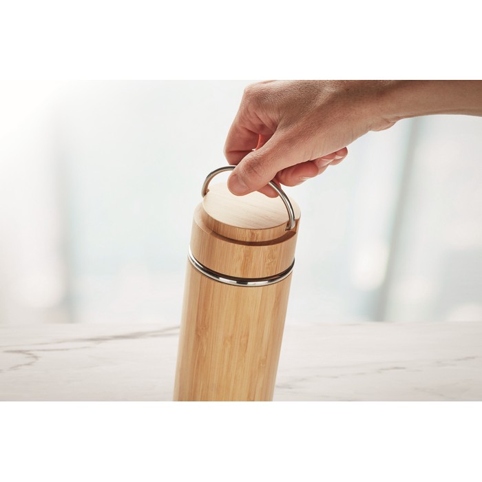 Double wall stainless steel/bamboo insulating vacuum flask with additional tea infuser inside. Capacity: 400 ml. Leak free.