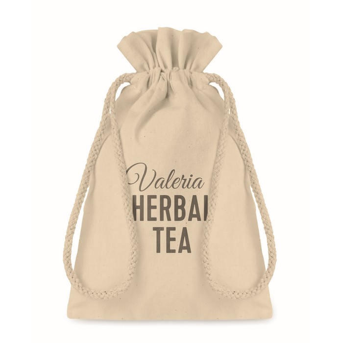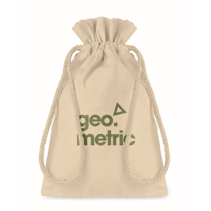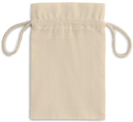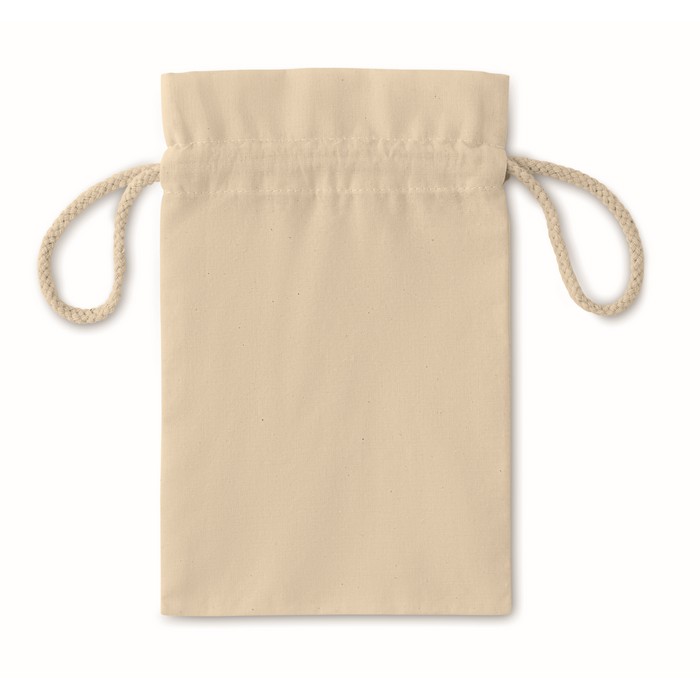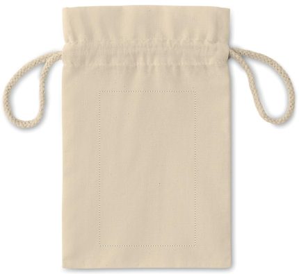 Small gift cotton draw cord bag. Size approx. 14 x 22cm. 105 gr/m².