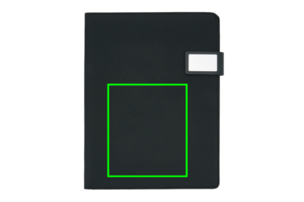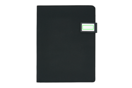 A4 tech portfolio with luxury magnetic metal closure. Inside: a tablet/phone stand, phone holder with see-through window which allows you to view and access your device. Suitable for most common phones. With sleeve for documents, 2 card holders and pen loop. Including recycled A4 notepad.