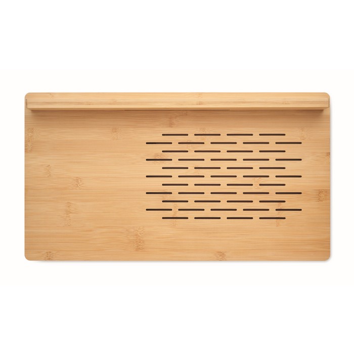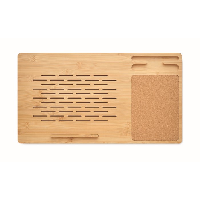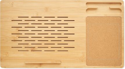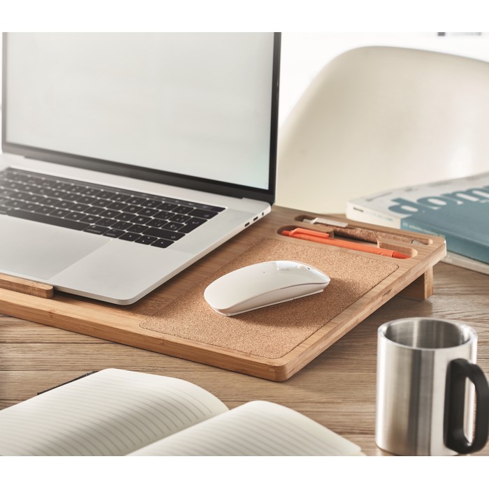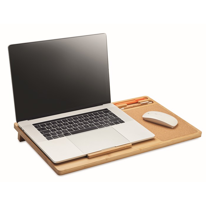 Bamboo laptop stand with staggered air vents and with cork mouse pad.