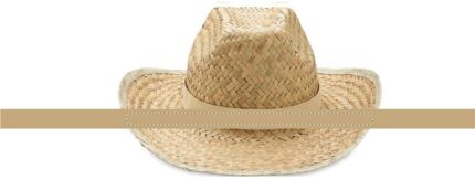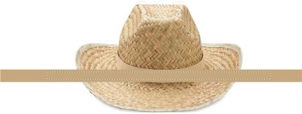 Natural straw hat in cowboy shape with polyester band.