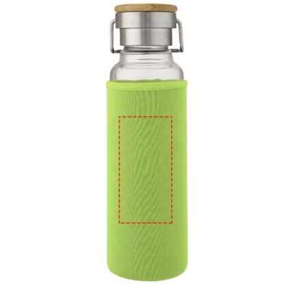 Single-walled borosilicate glass bottle with neoprene protective sleeve. Features a screw-on lid with bamboo top, as well as a handle for easy carrying. The bottle is made from 100% durable borosilicate glass which conserves the freshness of the beverage, and it does not contain any harmful chemicals. BPA-free, tested and approved under German Food Safe Legislation (LFGB). Tested and approved for phthalates content according to REACH regulations. The bamboo used is from sustainable, environmentally and socially responsible sources. Volume capacity is 660 ml. By removing the neoprene sleeve and lid the bottle is dishwasher safe. Presented in a recycled cardboard gift box.