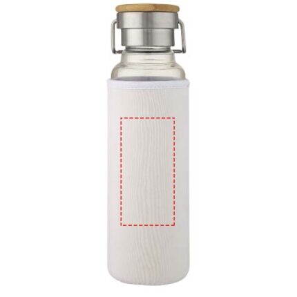 Single-walled borosilicate glass bottle with neoprene protective sleeve. Features a screw-on lid with bamboo top, as well as a handle for easy carrying. The bottle is made from 100% durable borosilicate glass which conserves the freshness of the beverage, and it does not contain any harmful chemicals. BPA-free, tested and approved under German Food Safe Legislation (LFGB). Tested and approved for phthalates content according to REACH regulations. The bamboo used is from sustainable, environmentally and socially responsible sources. Volume capacity is 660 ml. By removing the neoprene sleeve and lid the bottle is dishwasher safe. Presented in a recycled cardboard gift box.