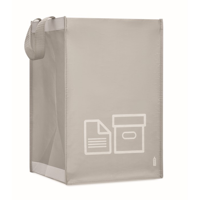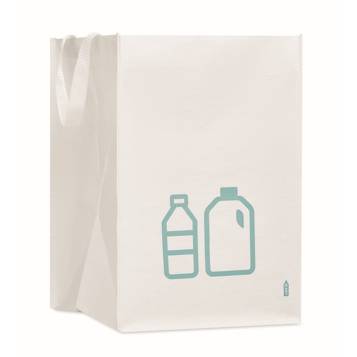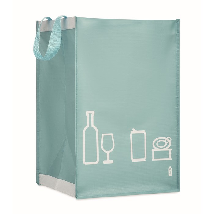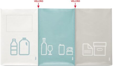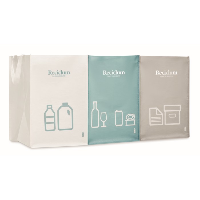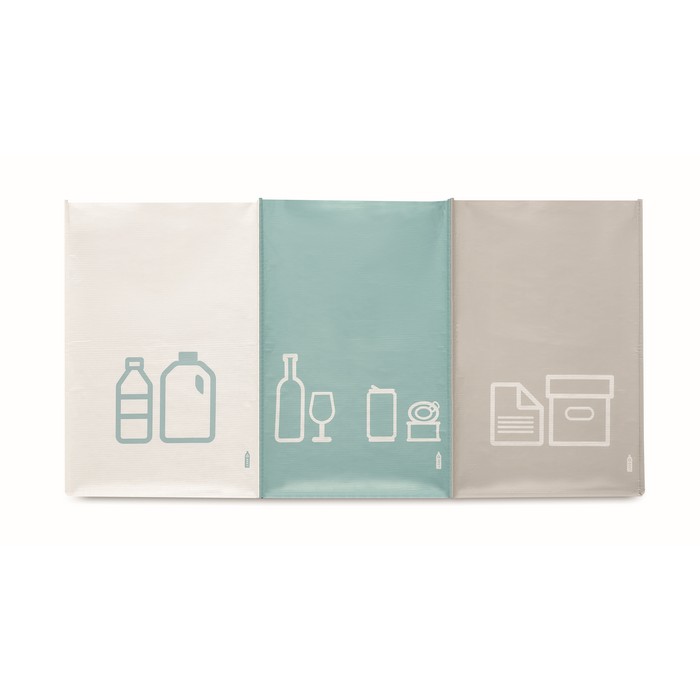 Set of 3 RPET non woven laminated recycling bin bags with handles to separate paper, plastic, metal and glass. The bags are connected via hook and loop closure so can be used individually or together.
