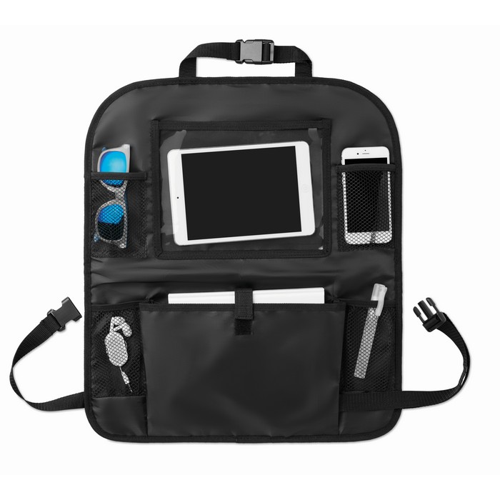 Car organizer for the back of the seat with several compartments in 420D polyester.