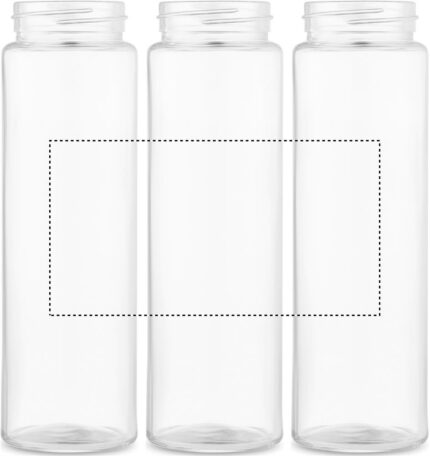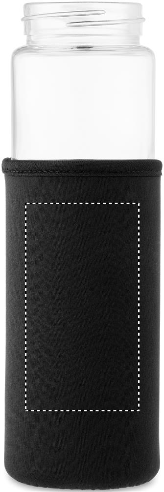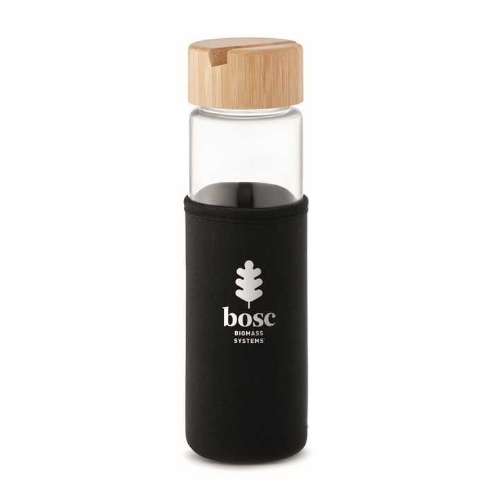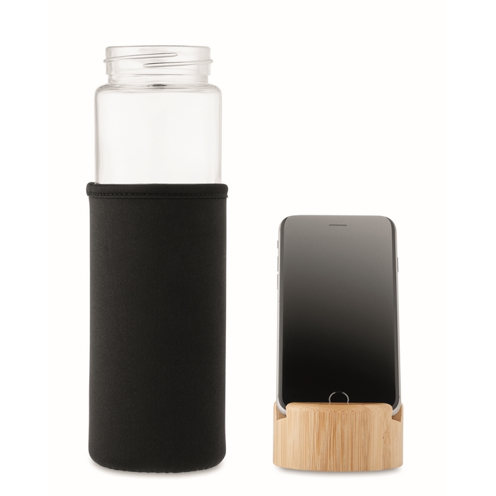 Glass bottle with neoprene sleeve, bamboo lid and smartphone stand functionality. Leak free. Capacity: 600 ml. Bamboo is a natural product, there may be slight variations in colour and size per item, which can affect the final decoration outcome.