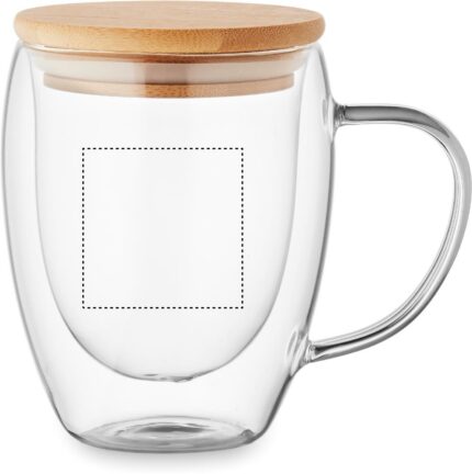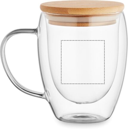 Double wall borosilicate glass mug with handle and bamboo lid. Capacity: 300 ml.