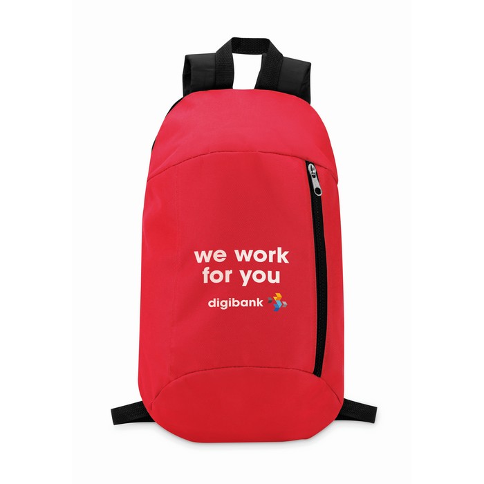 Backpack in 600D polyester with zippered outside pocket and for comfort a padded back section in 210D polyester.