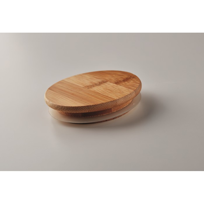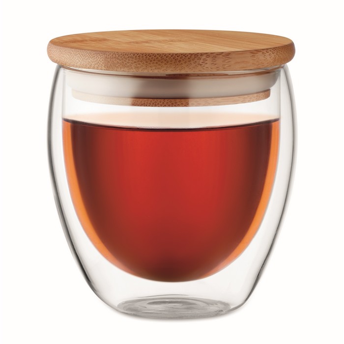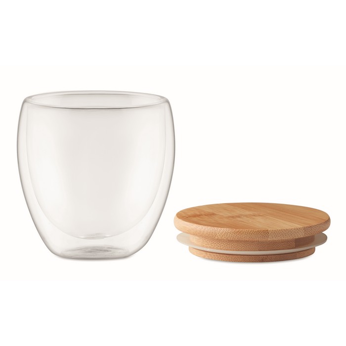Double wall high borosilicate glass with bamboo lid with silicone ring. Capacity 250 ml. Bamboo is a natural product, there may be slight variations in colour and size per item, which can affect the final decoration outcome.