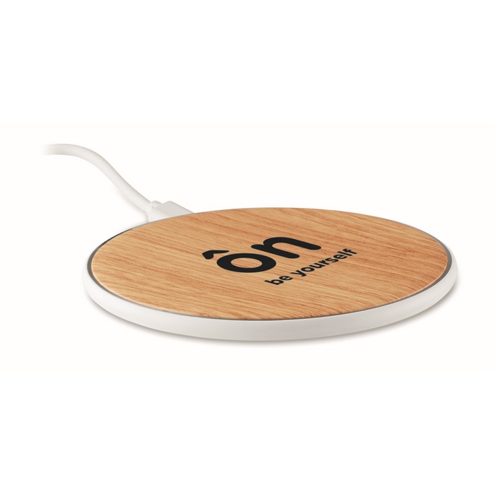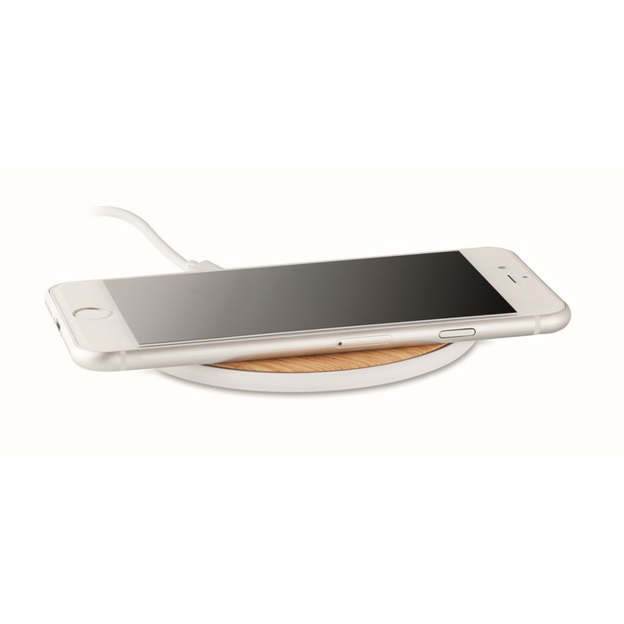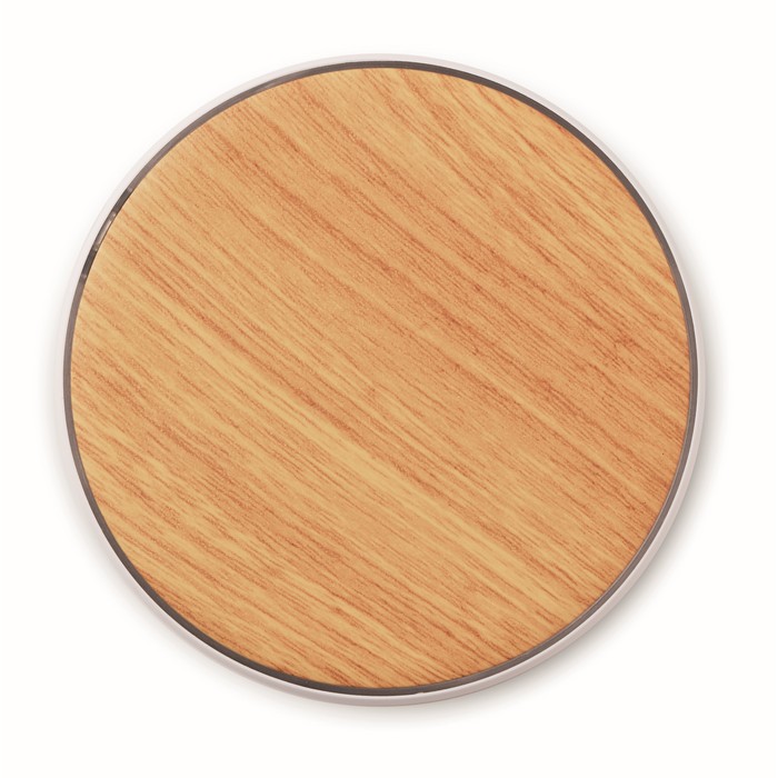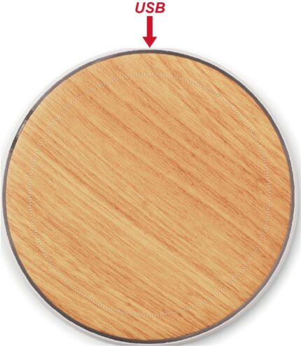 Wireless charger in ABS with bamboo look on the top. Connect device to your computer, place smartphone on it and let it charge. Output: DC5V/1A (5W). Compatible latest androids, iPhone® 8, X and newer.