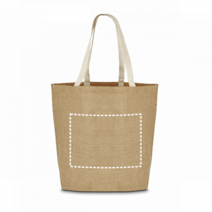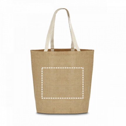 Jute shopping bag (360 g/m²) with laminated interior and 60 cm webbing handles. 385 x 445 x 165 mm