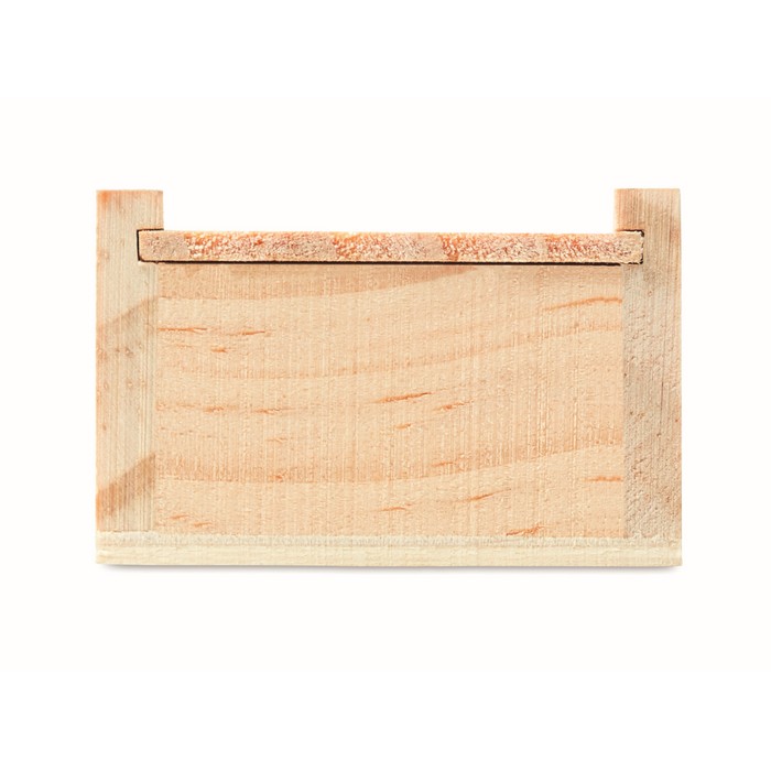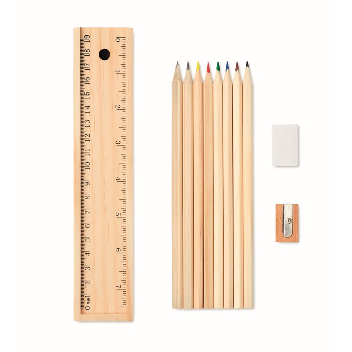 12 pieces stationery set with 2 pencils, 6 colouring pencils, 1 sharpener, 1 eraser and ruler incorporated in the lid of the wooden box.