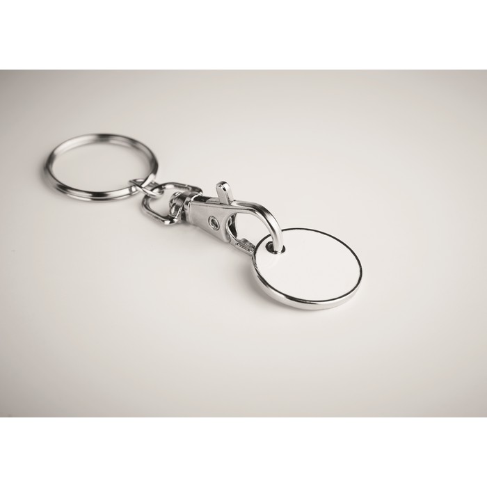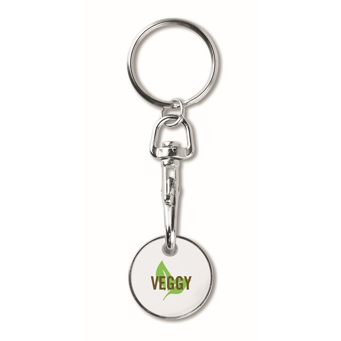 Metal keyring trolley euro token. With imitation enamel coating on the front side. Size Ø23,2×2,1 mm thickness.