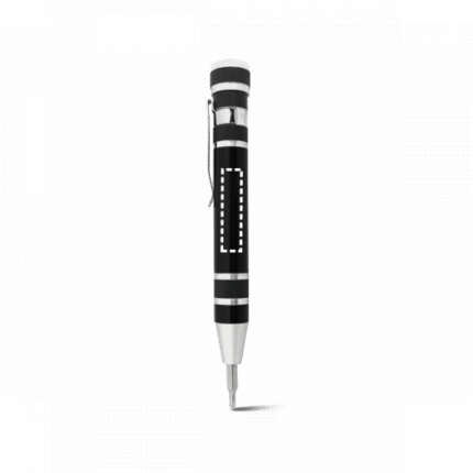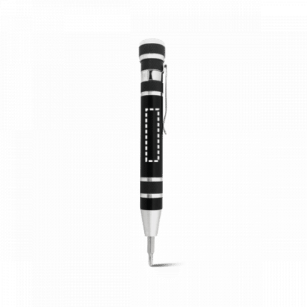 Pen shaped screwdriver set with 8 different removable tips. Practical tool with clip and the option to store all the components on the upper part of the body with lid. ø16 x 109 mm