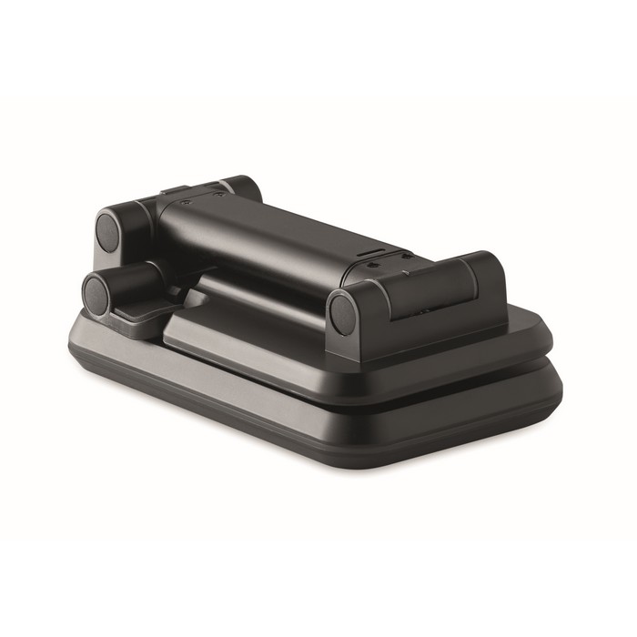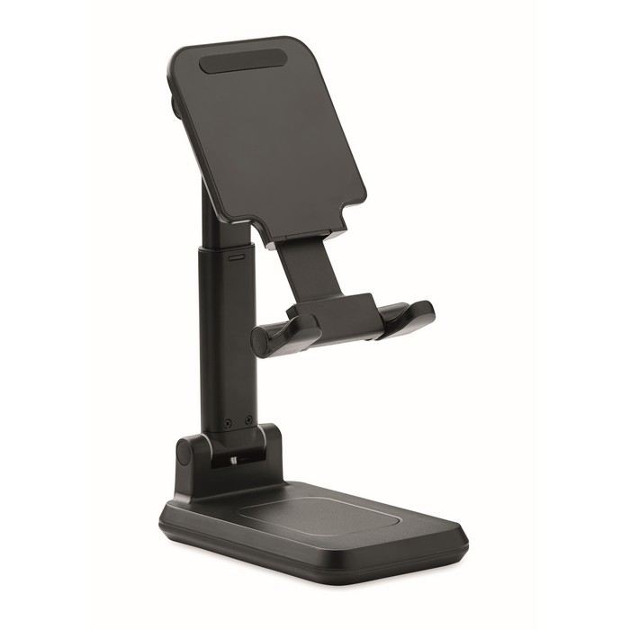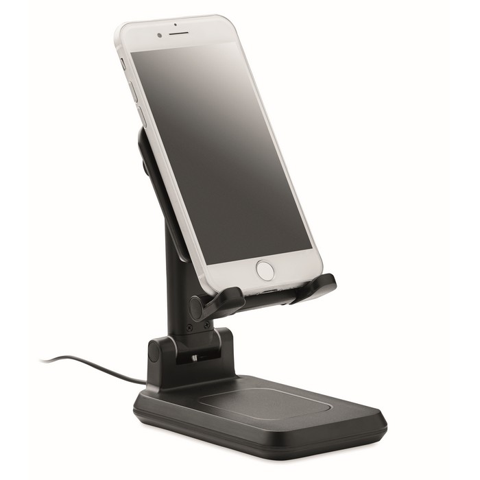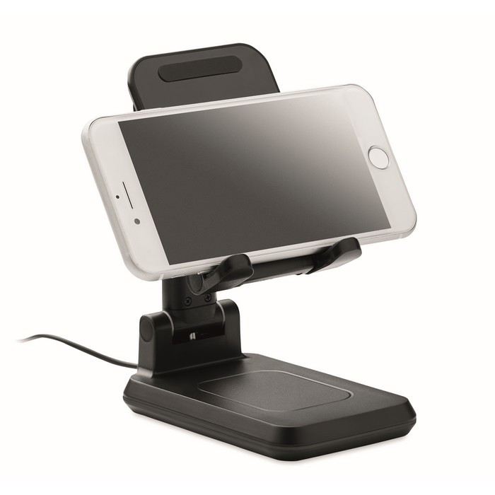 Wireless charger 15W in ABS for 1 device with extendable and foldable smartphone holder and stand. Output: DC 9V/1.67A (15W) for quick charging. Compatible with latest Androids, iPhone® 8, X and newer.