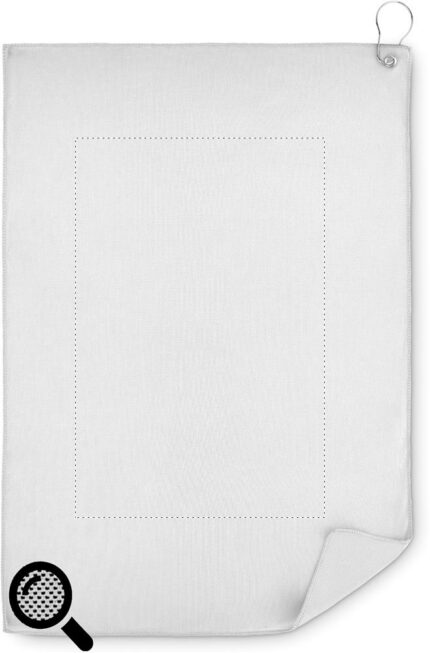 RPET polyester golf towel with iron hook hanger. Towel size: 40x60cm.