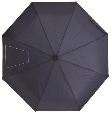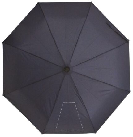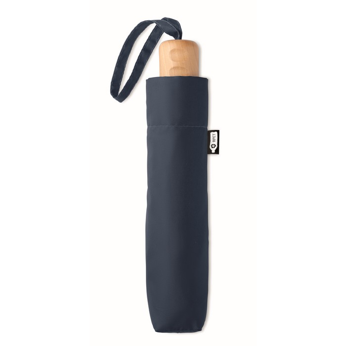 Foldable 21 inch umbrella, 3 sections with 190T RPET pongee fabric, black plated frame and ribs with wooden handle. Manual open and closure. Self material pouch.