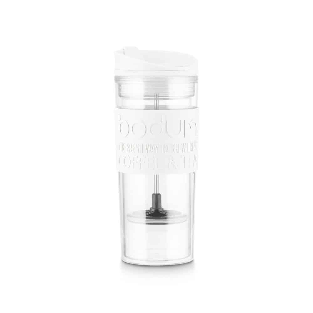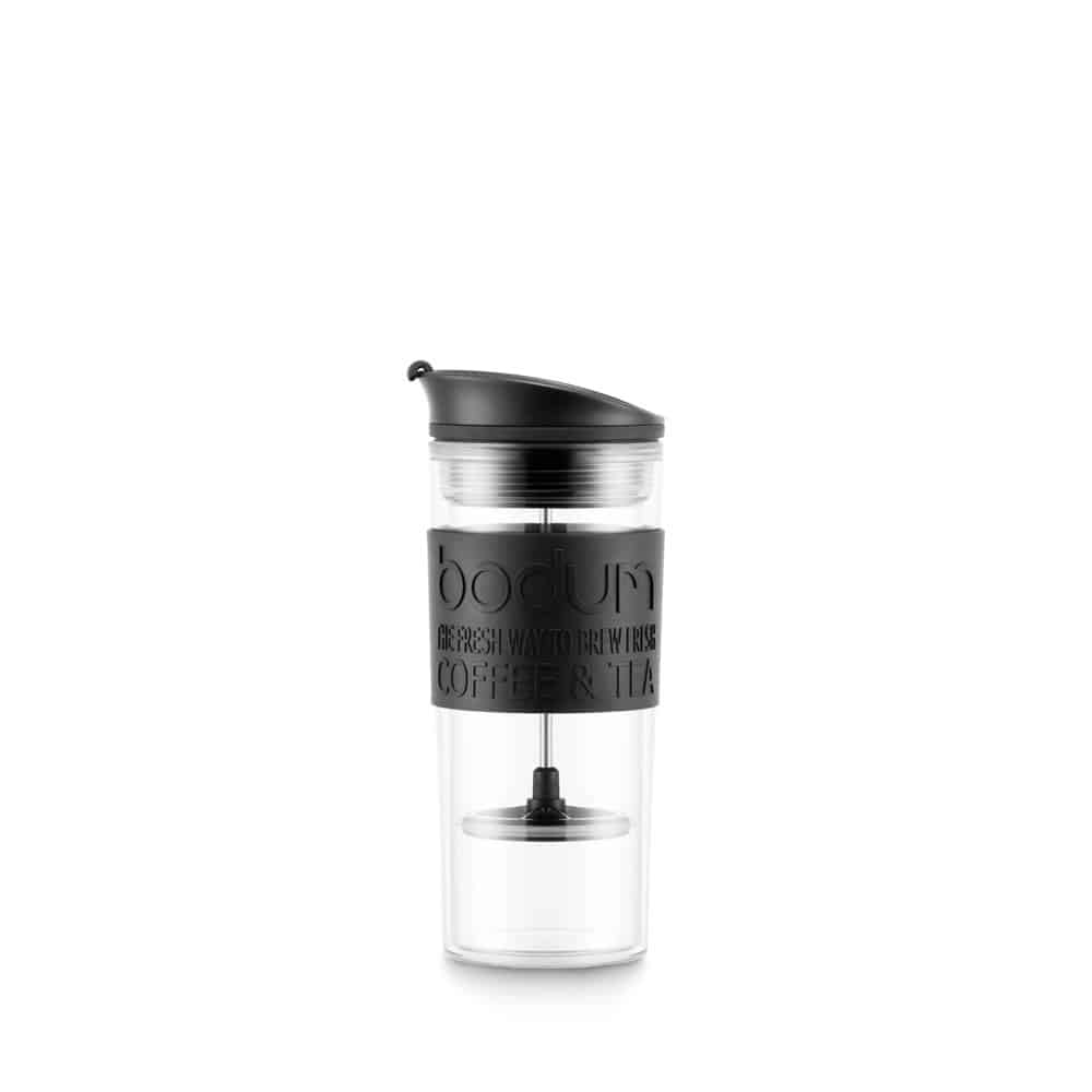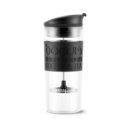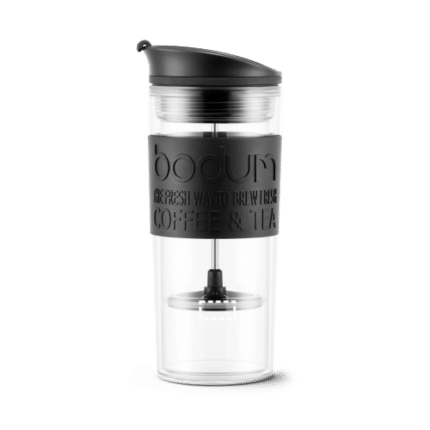 Double-walled vacuum-insulated French press made of BPA-free material. Featuring a mesh, silicone plunger and a non-slip silicone strip for easy and comfortable handling. The lid is spill-resistant, but not watertight to prevent possible over-pressure. The versatile Travel Press allows you to brew your coffee on the go. Fill it with home brewed coffee or even brew a loose-leaf tea. It ingeniously combines the properties of insulation with the additional benefits of the French press system, keeping coffee hot or cold to the touch depending on your preference. All parts are dishwasher safe. Capacity up to 450 ml. Supplied in a cardboard gift sleeve 190 x 190 x 24 mm