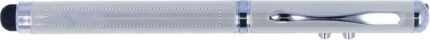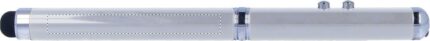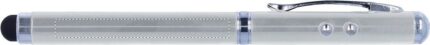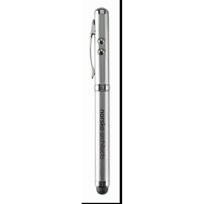 Laser pointer in metal. White LED light, red laser pointer and soft touch tip. Includes 3 button cell batteries. Delivered in metal tin box.