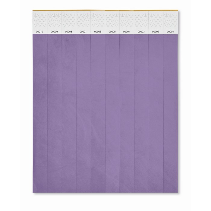 One sheet of 10 event wristbands. DuPont ™ Tyvek® 19mm wide. Including unique numbering on each wristband.