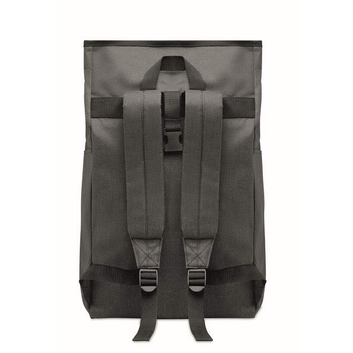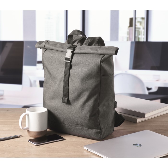 Backpack in 600D RPET 2 tone polyester with roll top closure.