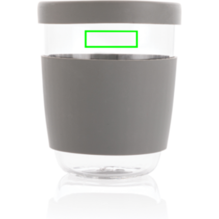 Enjoy your coffee at work or at home in this Ukiyo borosilicate glass with silicone lid and sleeve. The cup has a nice grip and a slim shape. A small vent in the lid allows steam to escape to prevent pressure build-up. BPA free. Capacity 360ml.
