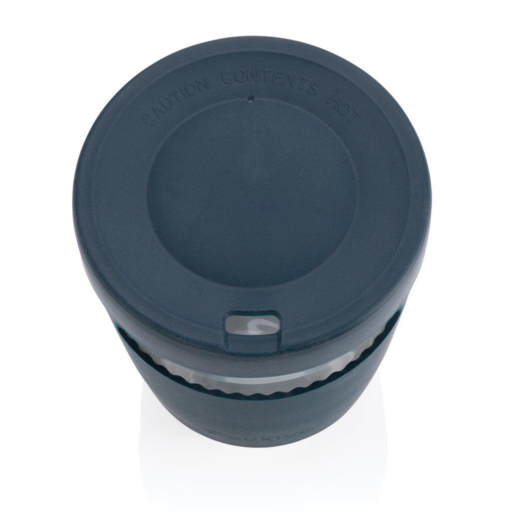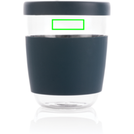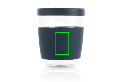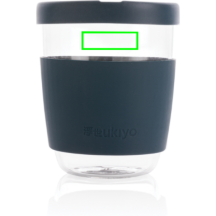 Enjoy your coffee at work or at home in this Ukiyo borosilicate glass with silicone lid and sleeve. The cup has a nice grip and a slim shape. A small vent in the lid allows steam to escape to prevent pressure build-up. BPA free. Capacity 360ml.