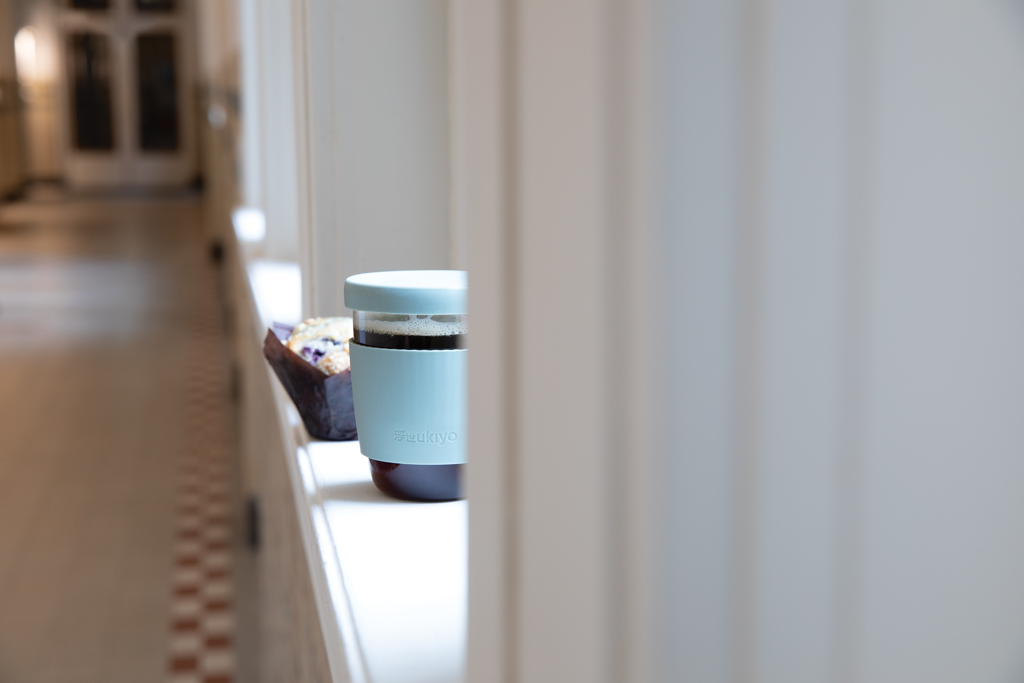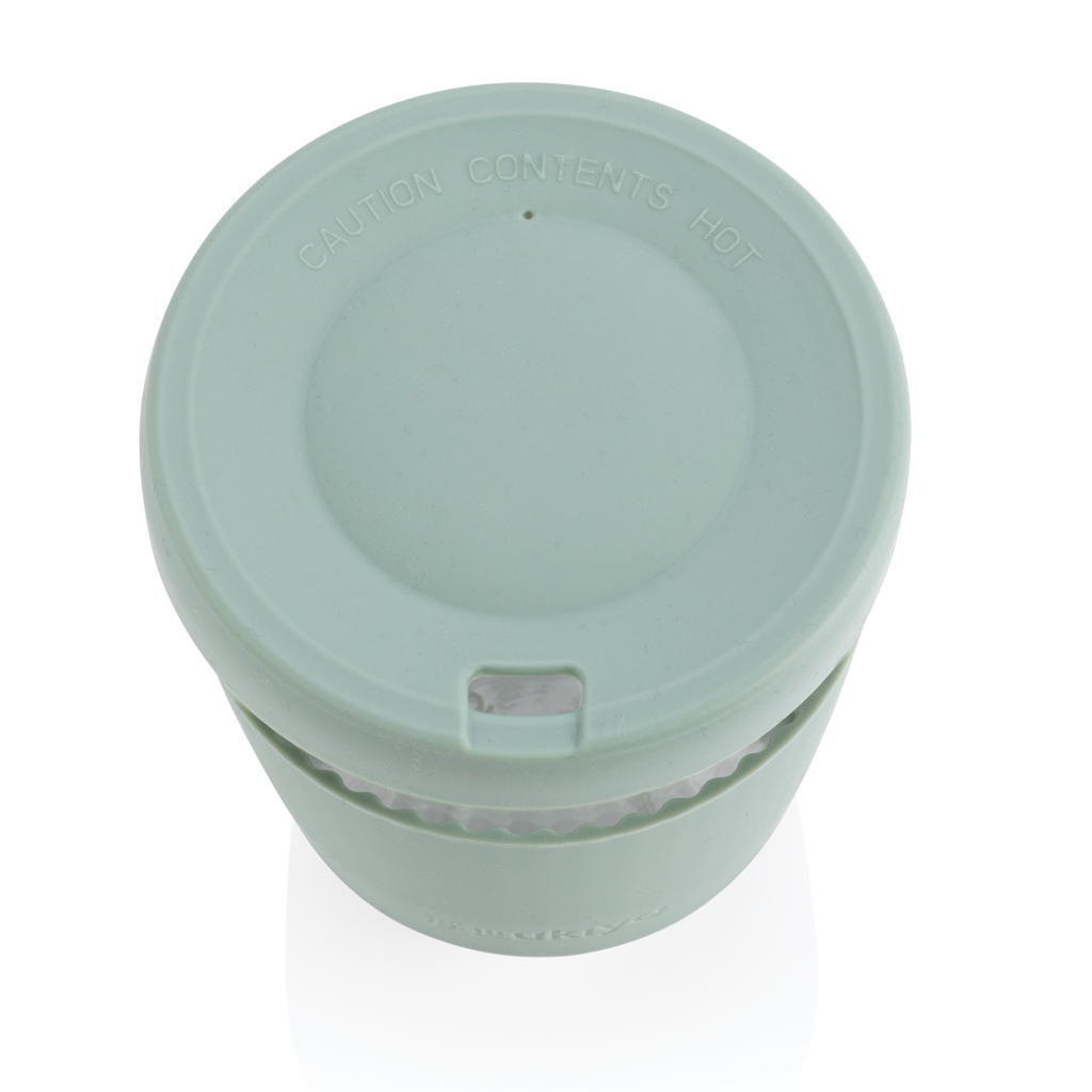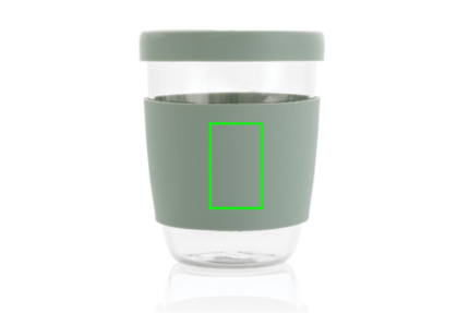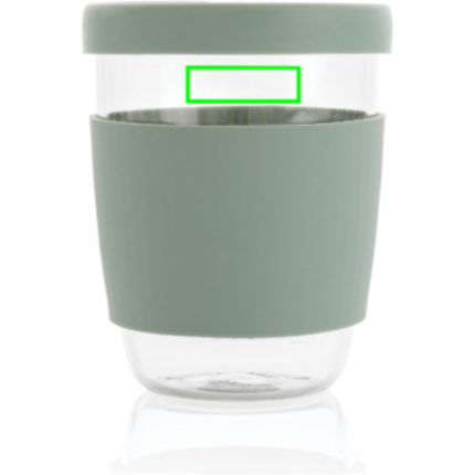Enjoy your coffee at work or at home in this Ukiyo borosilicate glass with silicone lid and sleeve. The cup has a nice grip and a slim shape. A small vent in the lid allows steam to escape to prevent pressure build-up. BPA free. Capacity 360ml.