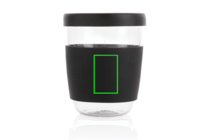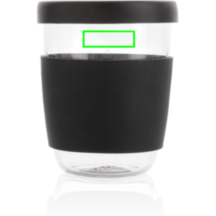 Enjoy your coffee at work or at home in this Ukiyo borosilicate glass with silicone lid and sleeve. The cup has a nice grip and a slim shape. A small vent in the lid allows steam to escape to prevent pressure build-up. BPA free. Capacity 360ml.