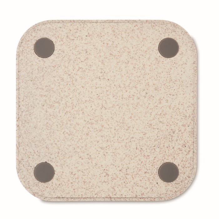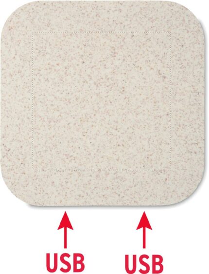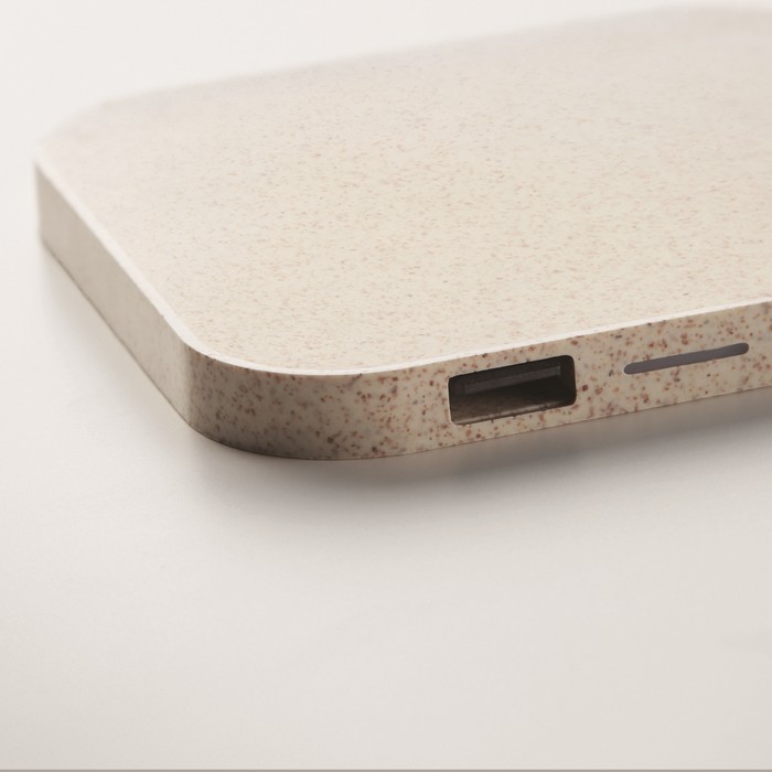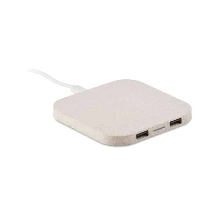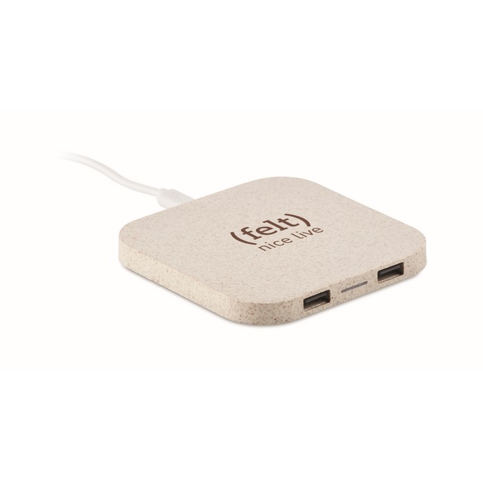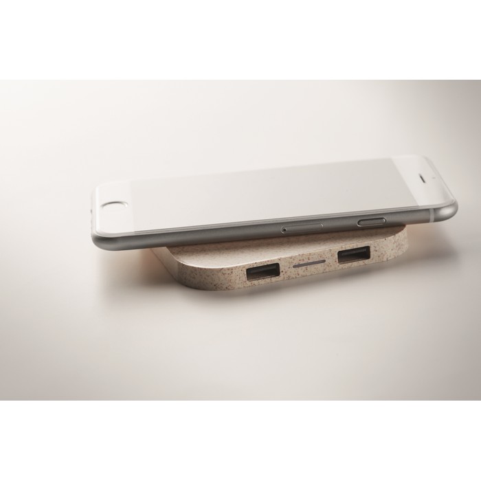 Wireless charging pad in wheat straw (35%) and ABS (65%) with 2 port 2.0 USB hubs. Output DC5V/1A (5W). Compatible latest androids, iPhone® 8, X and newer.