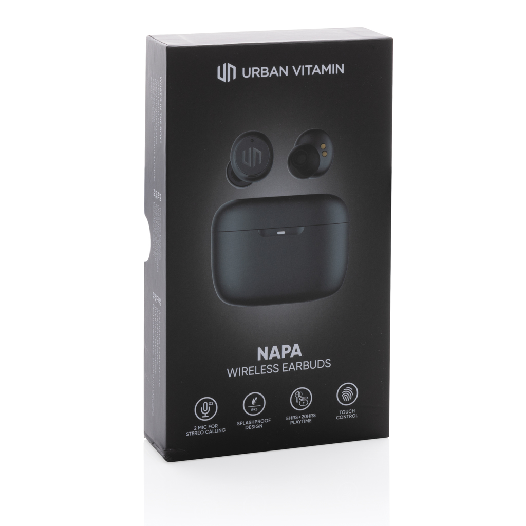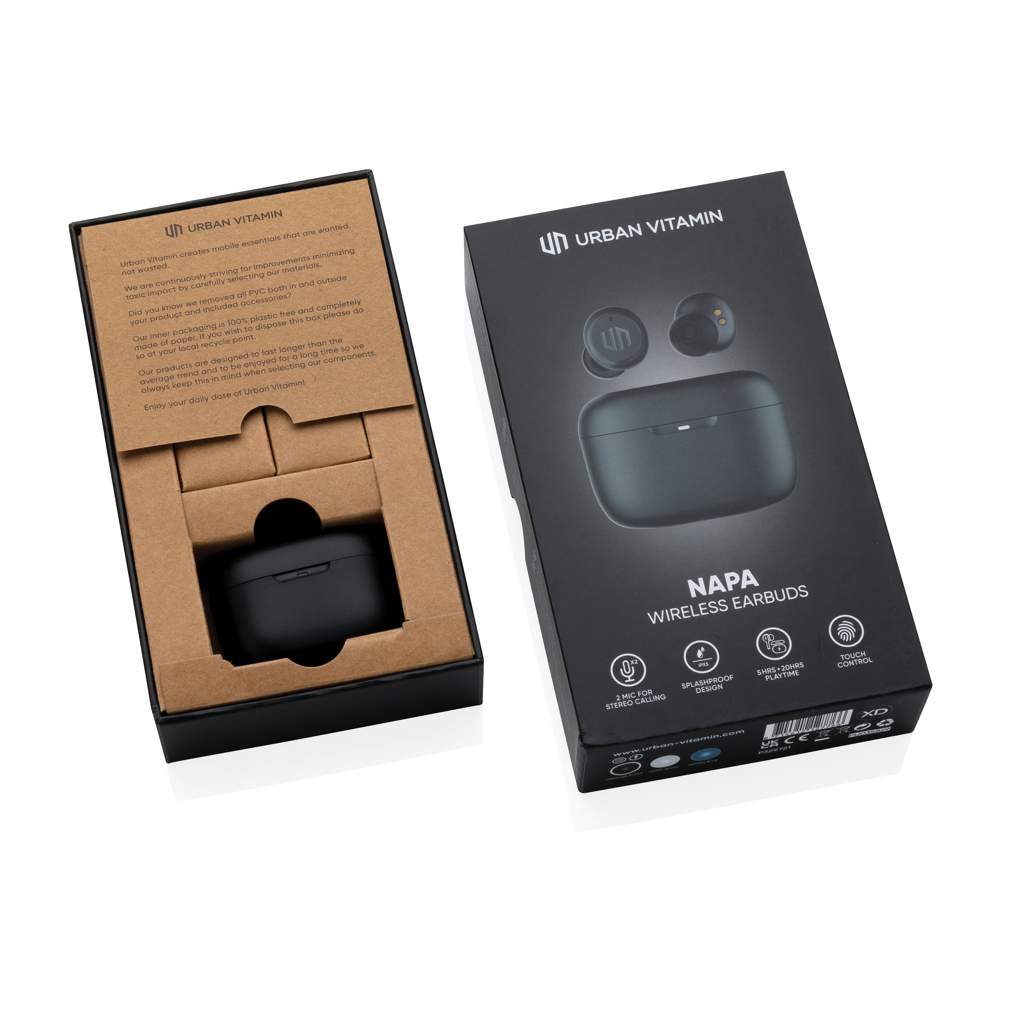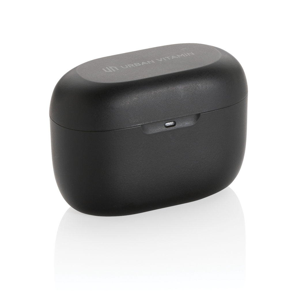 When you open the case and put in the earbuds, the intense bass hits you. How can an item so compact and portable deliver such rich and deep sound? The earbuds and portable charging case are designed to be able to carry no matter where you go and fit easily into your pocket. The comfortable earbuds have up to 5 hours of listening time and the charging case allows up to 20 hours of playback. Enough to keep you going all day! When receiving a call simply answer it in stereo sound thanks to the 2 integrated microphones. With the integrated touch control function you only have to tap the earbud to answer in crystal clear quality. The IPX 5 rating makes the earbuds weather, sweat and splash proof so no worries to take them outside. Urban Vitamin items are made without PVC and packed in plastic reduced packaging.