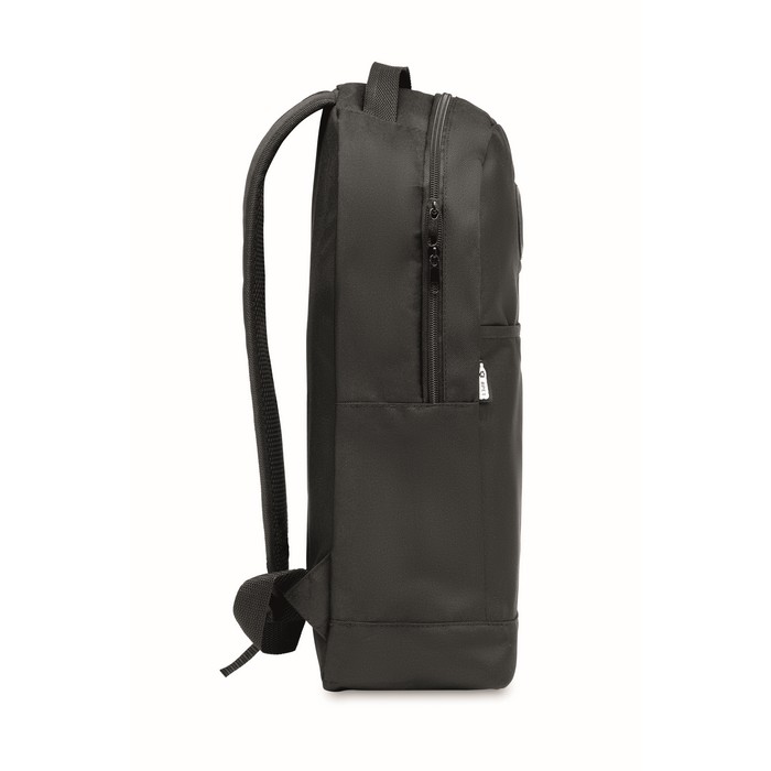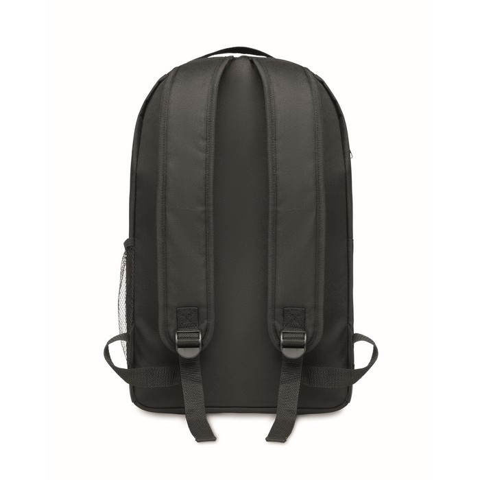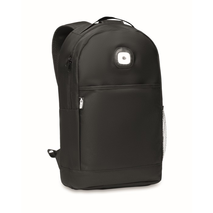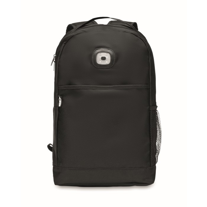 Backpack in 600D RPET with detachable COB light on the front panel. COB light in white colour with 3 different light brightness setting. Front pocket with hook and loop closure. Mesh pocket on the side. Button cell battery included.