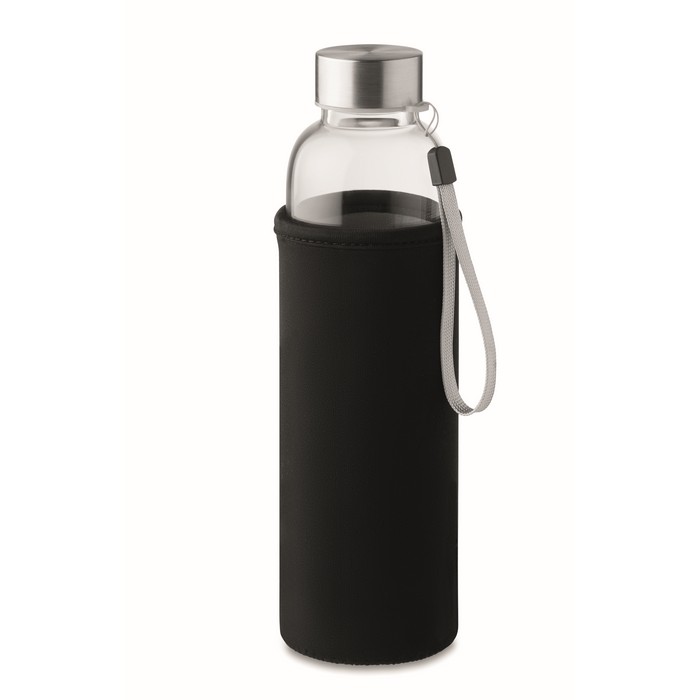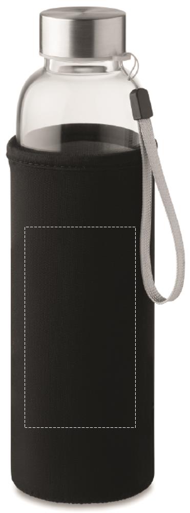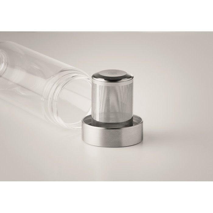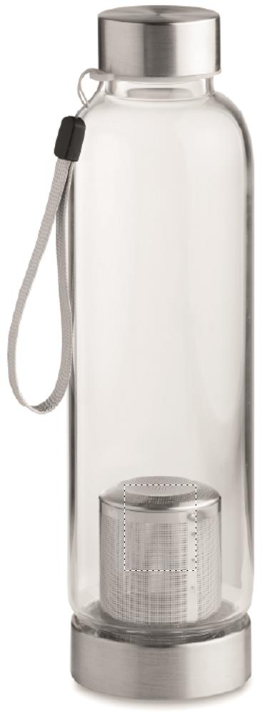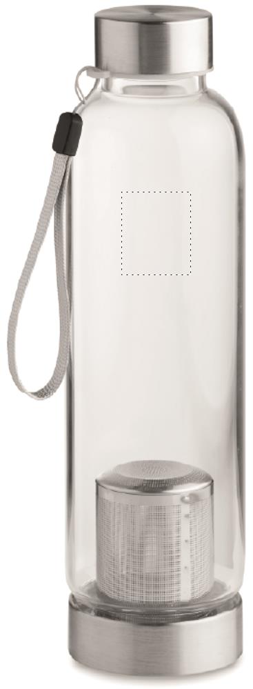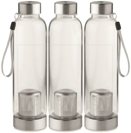 Single wall in high borosilicate glass bottle with tea infuser and neoprene pouch. Capacity 500 ml. Not suitable for carbonated drinks. Leak free. Laser engraving is not possible on borosilicate glass.