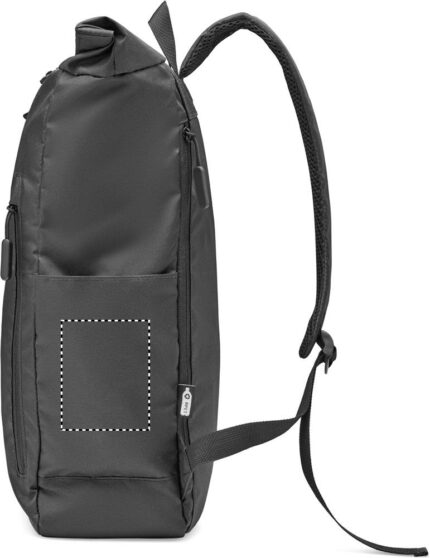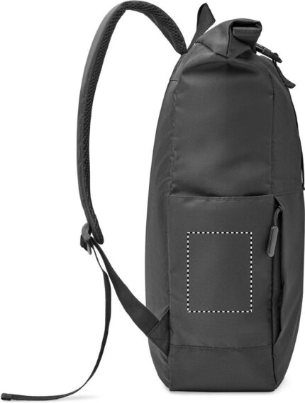 15 inch rolltop laptop backpack in 300D RPET polyester. Large zippered front pocket, hidden side pocket with small carabineer loop inside. The carabiner is not for climbing (non professional use).