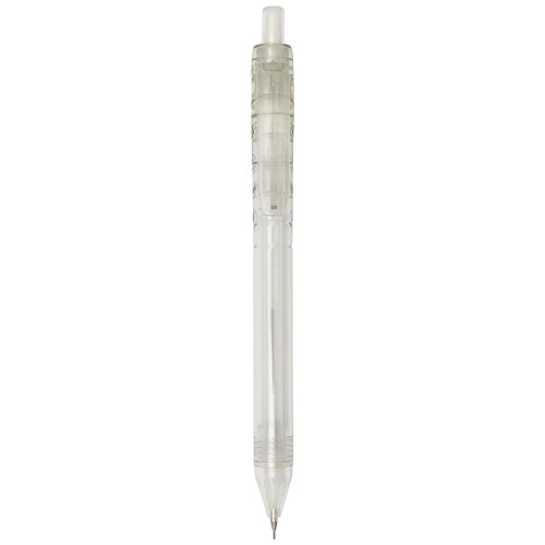 Mechanical pencil with click action mechanism with a transparent barrel. The barrel is made of recycled water bottles, which contributes to decreasing the amount of plastic waste.