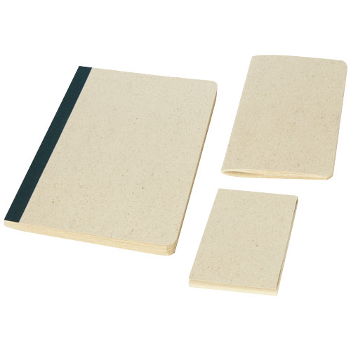 Stationery gift set consisting of an A5 size reference flexible 64 sheet notebook, a small stitched booklet (10 x 15 cm), and a memo bloc (8 x 11.5 cm). All 3 items are made of 90 g/m2 grass paper that contains up to 40% grass fibers and has a low environmental impact. Less water and energy are used in the production process compared to regular paper, and no chemicals are used. All items are made in Europe contributing to a lower carbon footprint.