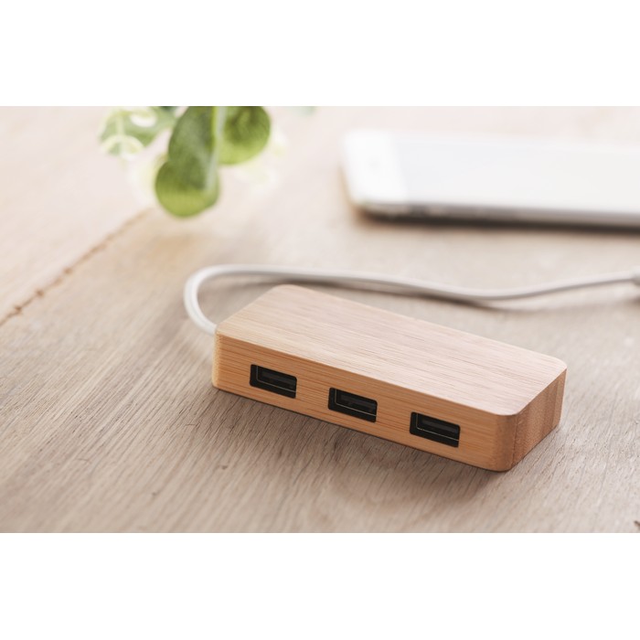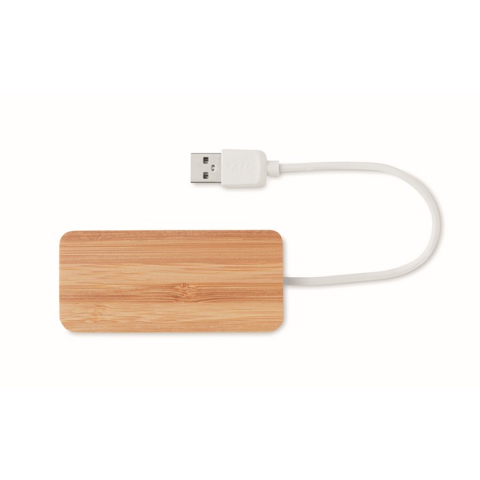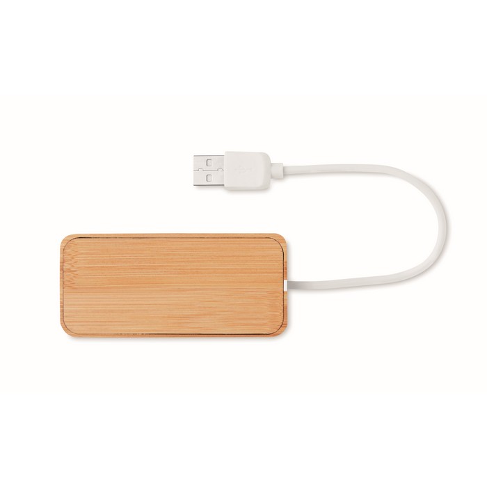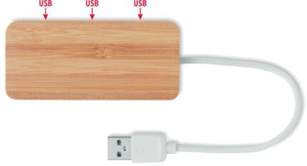 3 port 2.0 USB hub in bamboo case. Cable length 18,5 cm. Bamboo is a natural product, there may be slight variations in colour and size per item, which can affect the final decoration outcome.