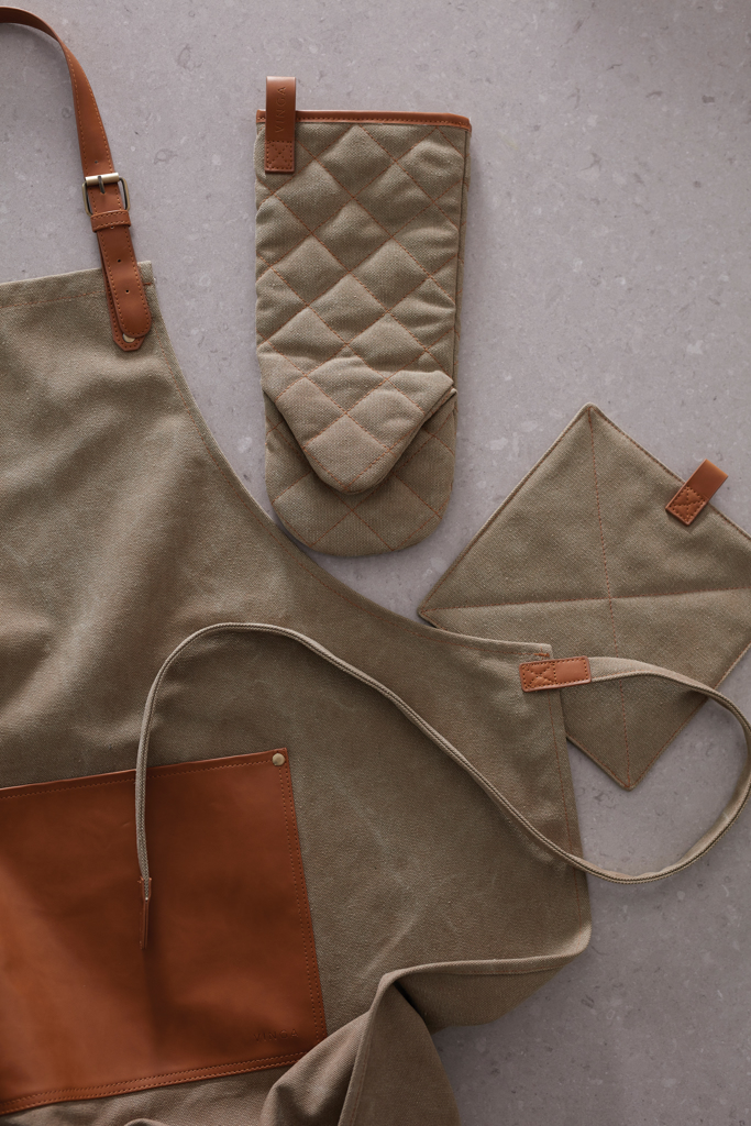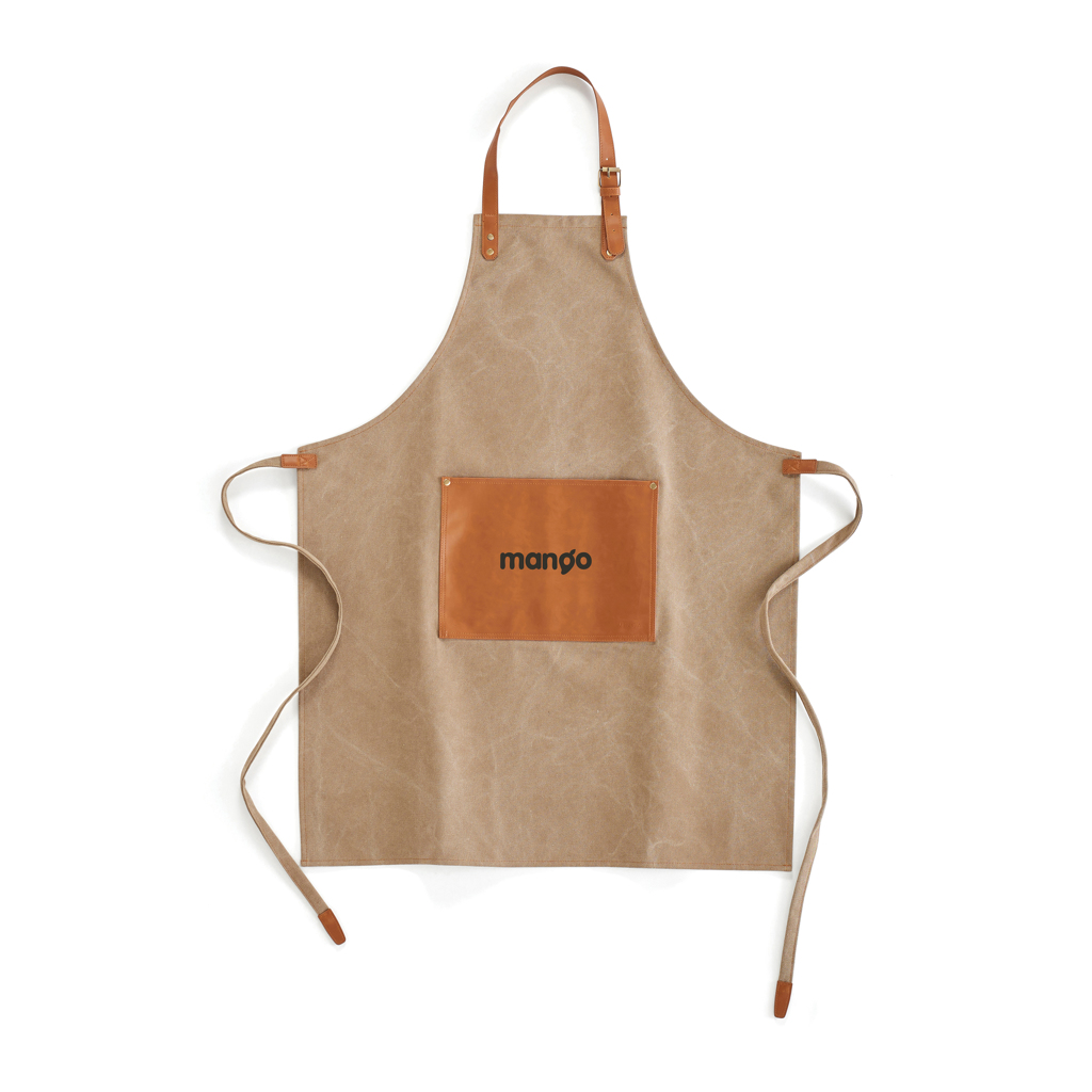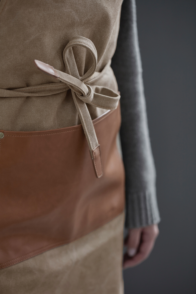 Robust apron in stonewashed canvas 500 gsm with vegan leather details. An apron that ages with dignity.