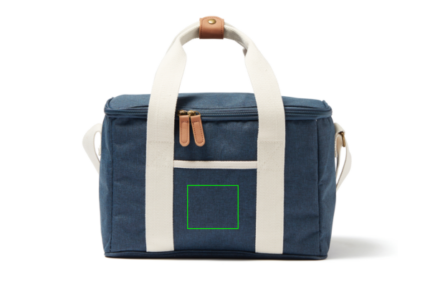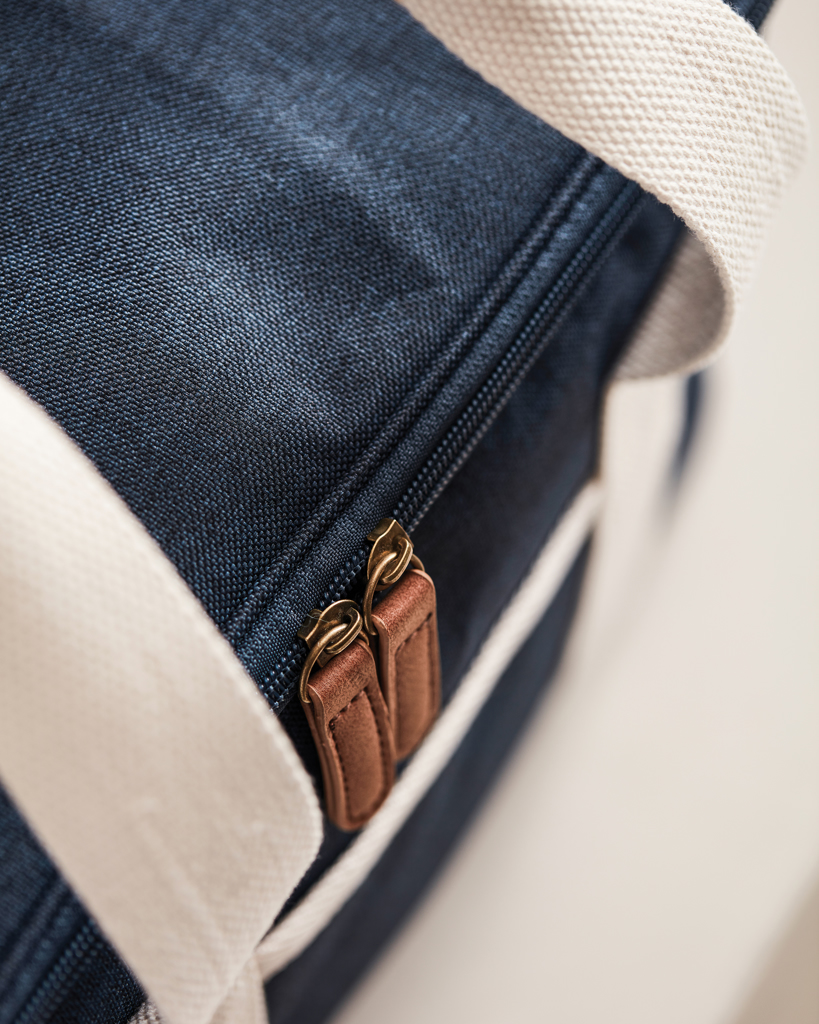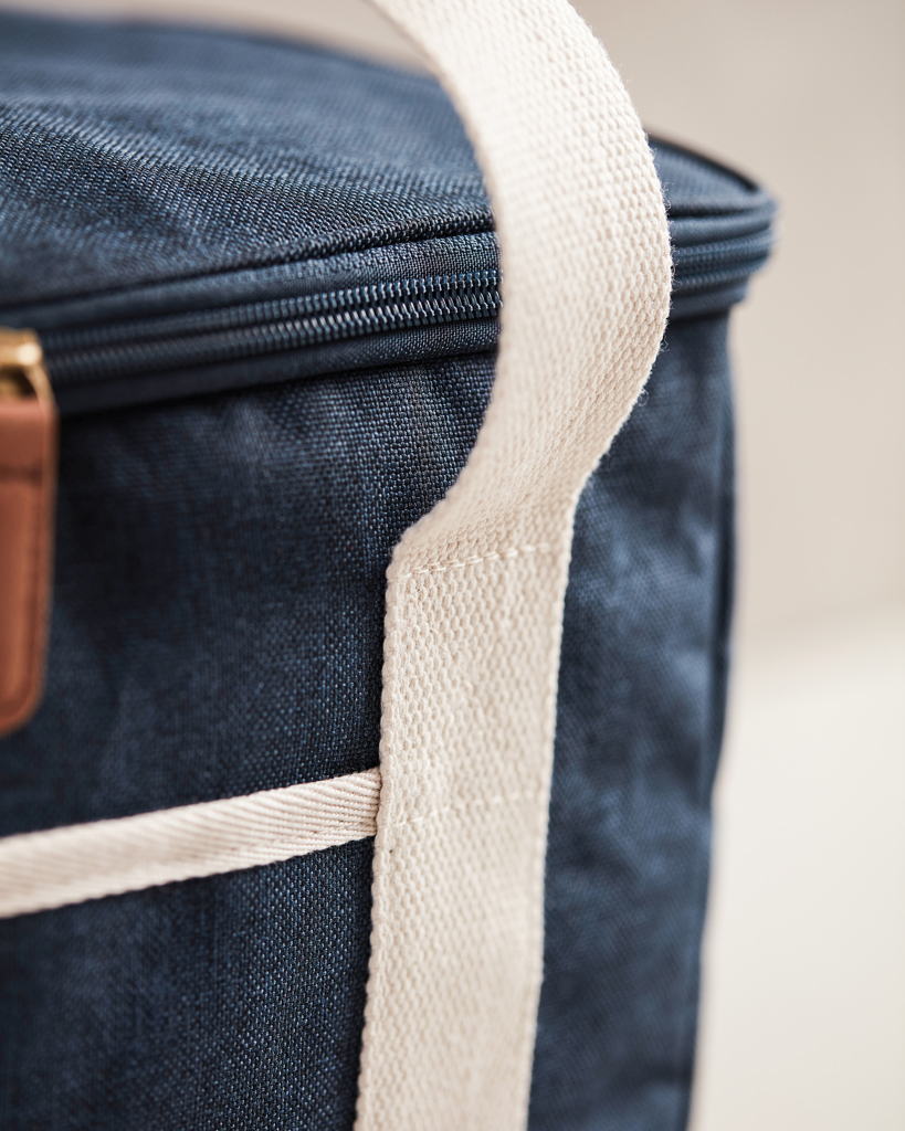 The ultimate cooler basket, mottled tone by tone with details in imitation leather and cotton. Made from 50% recycled material from PET bottles. There is also a small compartment on the outside of the cooler bag, providing space for other items as well. The thick PEVA padding ensures that the cold is retained for a long time. It is also easy to clean and dry after use. Thanks to the adjustable shoulder strap and the double handle, you have several ways to carry the cooler basket.