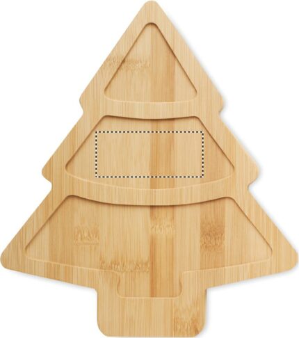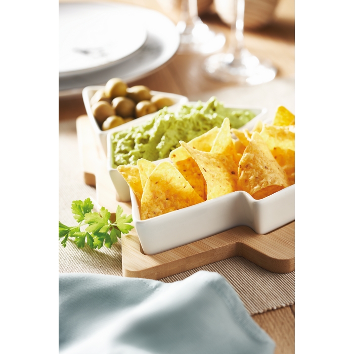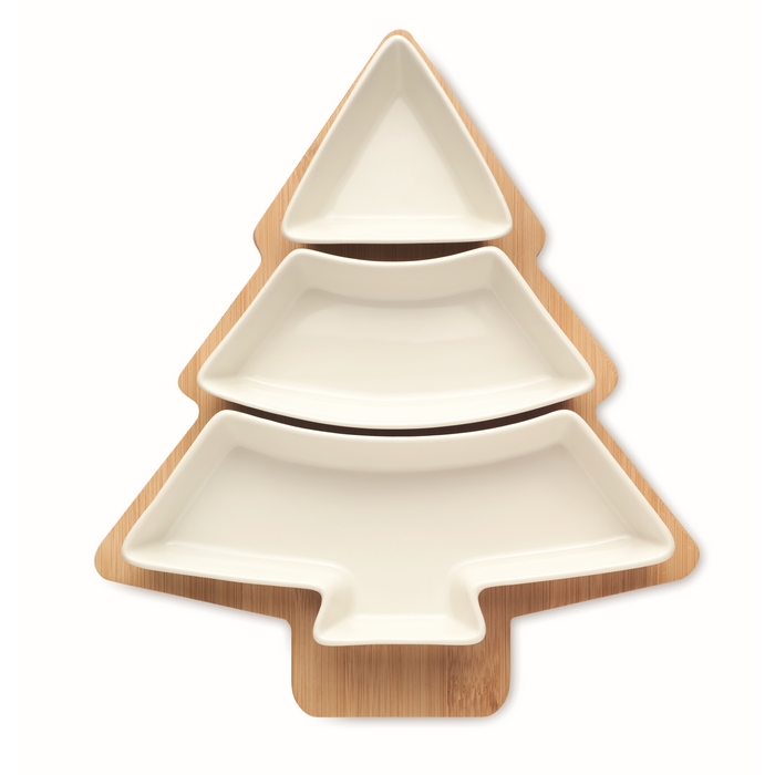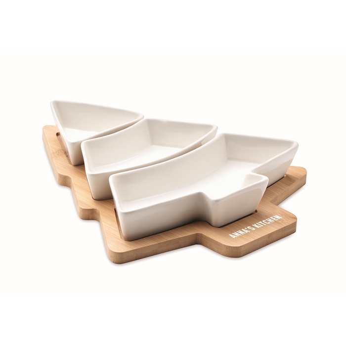 Tree-shaped bamboo serving platter with three ceramic serving dishes. Bamboo is a natural product, there may be slight variations in colour and size per item, which can affect the final decoration outcome.