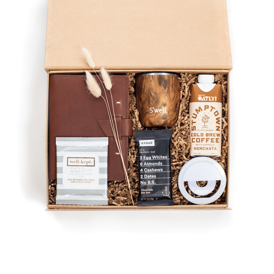 Virtual Welcome Kit. Oι ψηφιακές συναντήσεις είναι εδώ για να μείνουν, οπότε γιατί να μην καλωσορίσετε τους συμμετέχοντες με στυλ; Το κουτί δώρου με την υπογραφή «Virtual Welcome Kit» είναι γεμάτο με όλα όσα πρέπει να έχουν οι καλεσμένοι σας για την επερχόμενη εκδήλωση και να είναι έτοιμοι για το e - meeting! Θα φαίνονται καλύτερα  με ένα ring light για τον τέλειο φωτισμό και θα είναι οργανωμένοι για τη λήψη σημειώσεων με ένα δερμάτινο ημερολόγιο και ένα κομψό στυλό. Κρατήστε τους σε εγρήγορση με έναν κρύο ρόφημα- καθώς και με έναν θερμό για να τον απολαύσουν καλύτερα. Τέλος, συνδυάστε μια μπάρα και βοηθήστε τους στο να διατηρήσουν το γραφείο καθαρό με τα μαντηλάκια καθαρισμού.