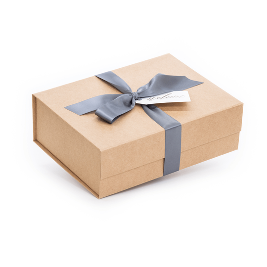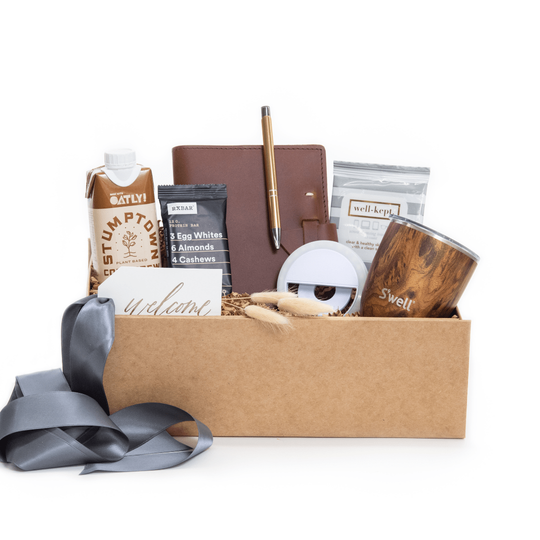 Μια καφέ συσκευασία δώρου με Virtual Welcome Kit γκρι κορδέλα.