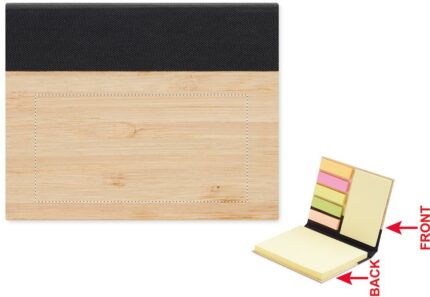 3 piece sticky note memo pad with bamboo hrd cover. Large and medium yellow sticky notes pads and 5 assorted colours page markers.