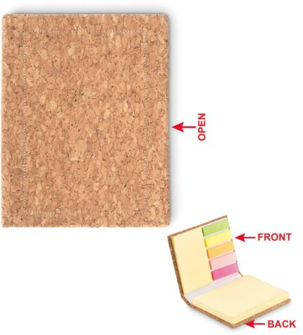 3 piece sticky note memo pad with hard cork cover. 50 sheets of large and 25 sheets of medium yellow sticky notes pads and 5 assorted colours page markers. Cork is 100% natural material. Due to its structural nature and surface porosity the final print result per item may have deviations.