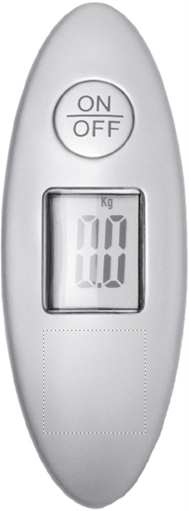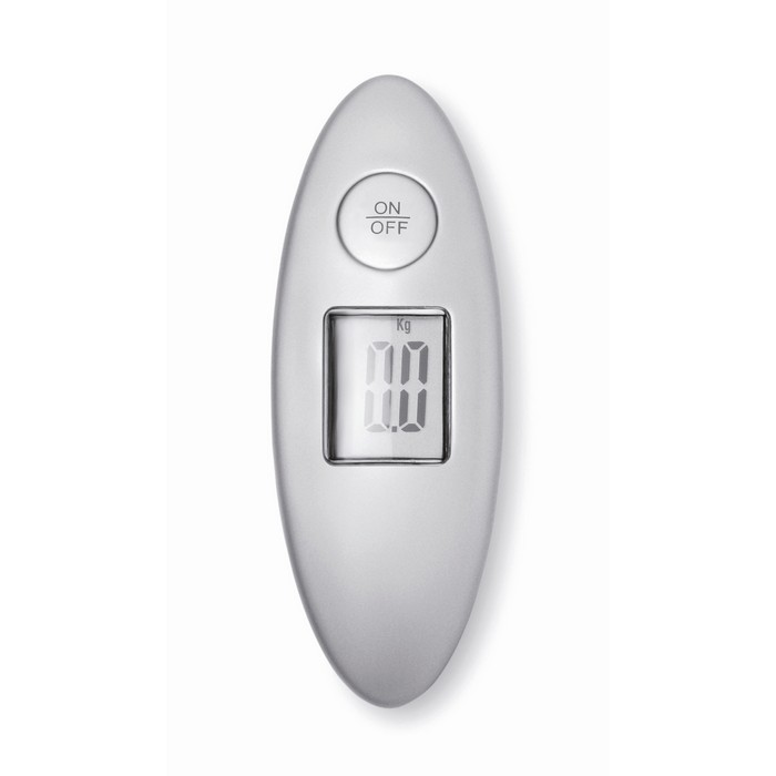 Luggage scale in ABS casing. Maximum capacity measure: 40 kg. Unit measure in kilogram or pounds. Powered by 1 cell battery included. Individual packaging in silver carton box.